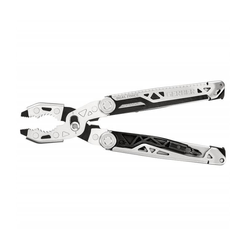 Pri zahtevnih opravilih je pogosto lažje poseči po ustreznem kompletu klešč v škatli z orodjem – do zdaj. Gerber Dual-Force ni povprečno večnamensko orodje, saj se ponaša z večplastno konstrukcijo, ki zagotavlja dvakrat večjo moč čeljusti orodja in dvakrat večjo silo, da lahko opravi vsako nalogo, ki je pred vami. Nastavljiva dvopoložajna čeljust z drsnim sklepom in izjemno veliki zobje se trdno oprimejo različnih pritrdilnih elementov in zagotavljajo neprimerljiv nadzor. Razpon rok je za 47 % ožji kot pri konkurenčnih orodjih, kar omogoča optimalen oprijem in 2-krat večjo silo. Dodatne funkcije vključujejo vrtalnik s sredisnko osjo, gladko rezilo noža, fino/ grobo pilo, žago in dodatno shrambo za nastavke. Gerber Dual Force večnamensko orodje ponuja kar 12 orodij!