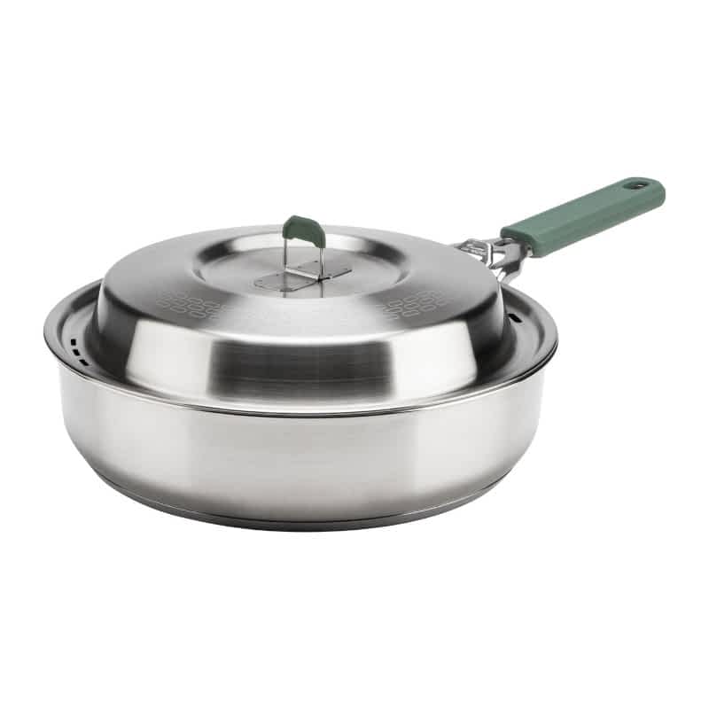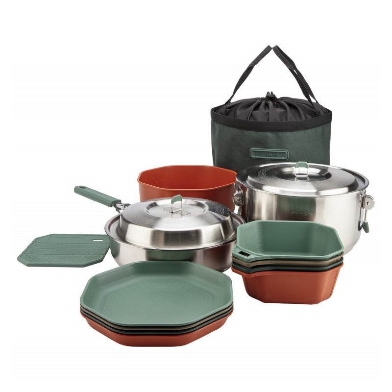 Gerber Kuhinjski Set ComplEAT je 16-delni popoln komplet za vse, ki želijo enostavno pripraviti obrok za večjo skupino kampistov. Vključuje lonec in ponev z velikimi kuhalnimi površinami ter 3-slojno konstrukcijo, ki zagotavlja enakomerno porazdelitev toplote. Ta komplet vam omogoča brezskrbno pripravo in postrežbo obrokov, hkrati pa pomaga pri pripravljalnih nalogah. Ko je čas za premik, se vse skupaj zapakira v priročno torbo za kompaktno in varno shranjevanje med potovanji.